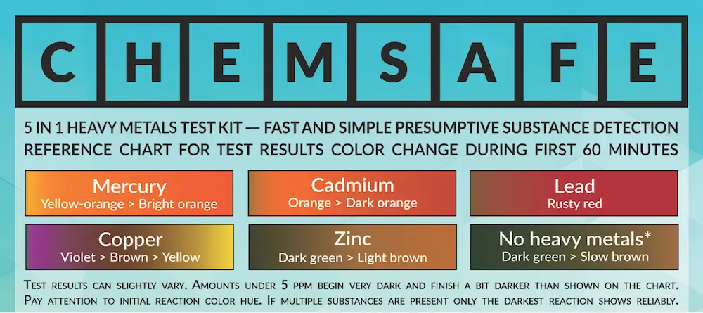 The ChemSafe Heavy Metals Test 5-in-1 is suitable for detecting cadmium, mercury, lead, copper, and zinc in concentrations as low as 1 ppm. It is a basic test for identifying toxic metals. Learn more.